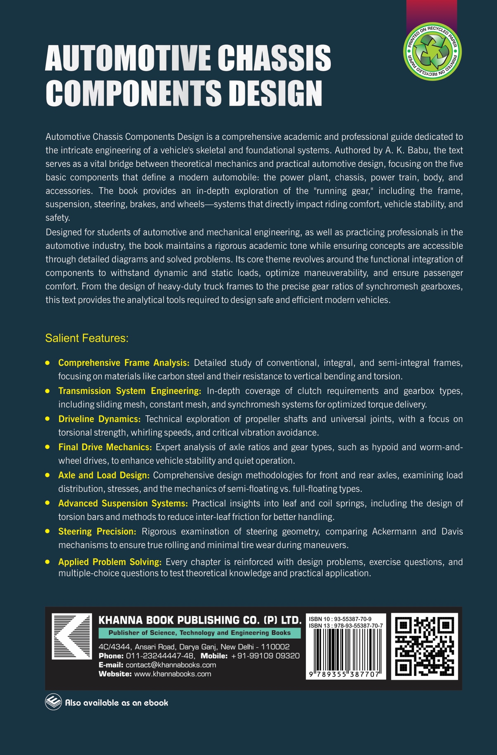 This book is designed for students undertaking a subject 'Vehicle Body Engineering/Auto Body Engineering' in the undergraduate and postgraduate programme of Automobile Engineering as per the latest revised syllabus of all Indian Universities. The book Provides a clear explanation of vehicle body parts and systems with unique illustrations. Each chapter takes the reader system...