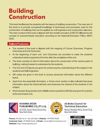 This book familiarizes the students with the basics of building construction. The main aim of this book is to provide conceptual knowledge of techniques and processes used for the construction of buildings that can be applied with the model curriculum of AICTE followed by the concept pf outcome-based education according to the National Education Policy (NEP) 2020.