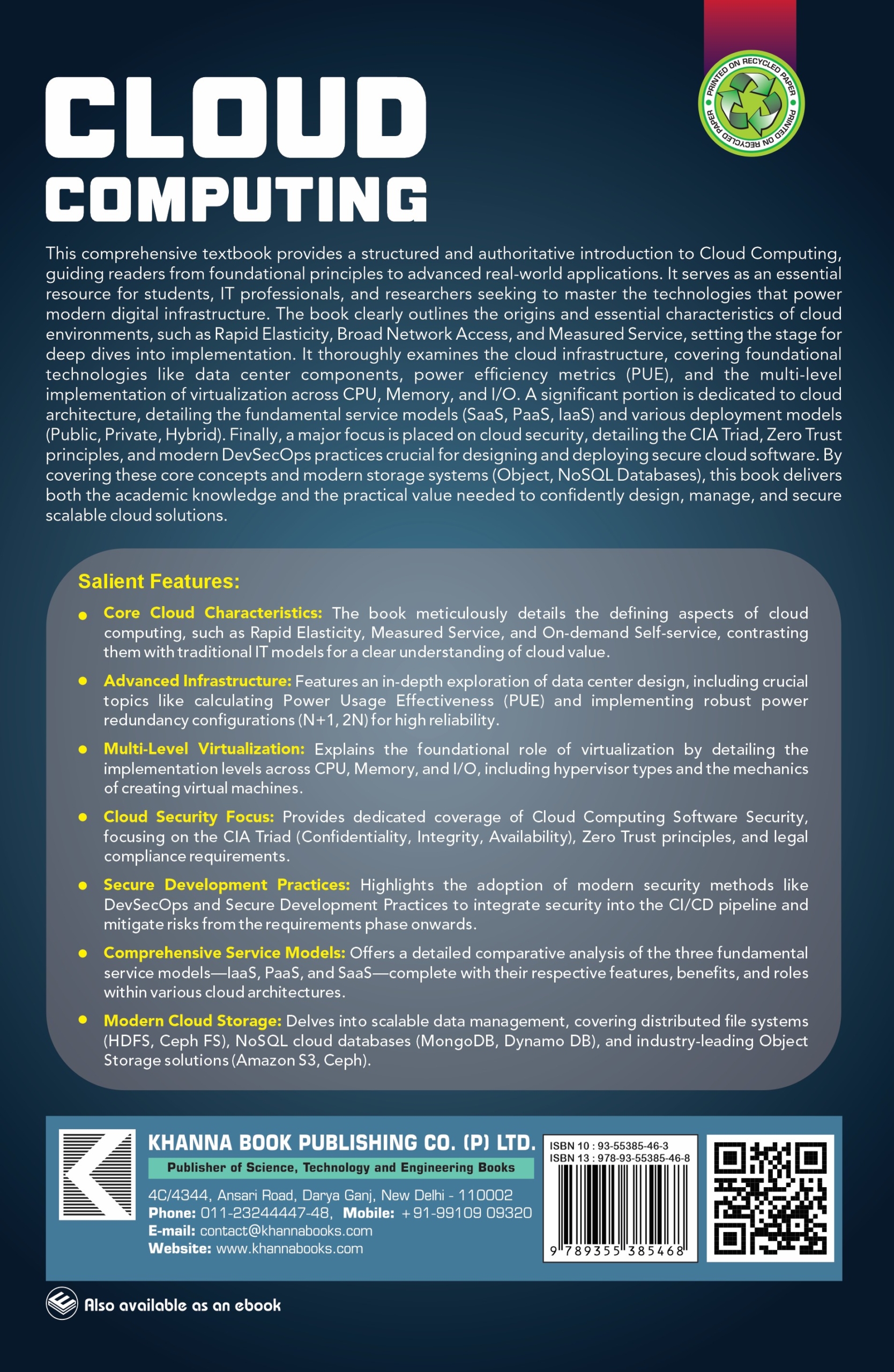 This comprehensive textbook provides a structured and authoritative introduction to Cloud Computing. guiding readers from foundational principles to advanced real-world applications. It serves as an essential resource urce for students, IT professionals, and researchers seeking to master the technologies that power modem digital infrastructure The book clearly outlines the origins and essential characteristics of cloud environments, such as Rapid Elasticity, Broad Network Access, and Measured Service, setting the stage for deep dives into implementation. It thoroughly examines the cloud infrastructure, covering foundational technologies like data center components, power efficiency metrics (PUE), and the multi-level implementation ofvirtualization across CPU, Memory, and I/O. A significant portion is dedicated to cloud architecture, detailing the fundamental service models (SaaS, PaaS, laaS) and various deployment models (Public, Private, Hybrid). Finally, a major focus is placed on cloud security, detailing the CIA Triad, Zero Trust principles, and modem DevSecOps practices crucial for designing and deploying secure cloud software. By covering these core concepts and modern storage systems (Object. NoSQL Databases), this book delivers both the academic knowledge and the practical value needed to confidently design, manage, and secure scalable cloud solutions.