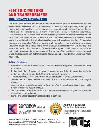 This book gives detailed information about the dc motors and the transformers that are considered as a workhorse of industry and heart of power system respectively. Although the modern industrial trend is to use ac motors and the electronically switched motors, the dc motors are still considered as a highly reliable and highly controllable alternative. Transformer is a device which finds an unavoidable application not only in transmission and distribution of ac power, but also in electronic and communication circuits. In this book, every concept is explained in the simplest possible way with maximum number innovative diagrams and examples. Wherever possible, photographs of real systems are provided. Laboratory experiments based on the theory are given at the end of every unit. Although this book is written for the students of diploma level program, it will prove to be useful to undergraduate engineering students as well. The content of this book is as per the syllabus of AICTE and is aligned with outcome-based education as per the National Education Policy (NEP)2020.