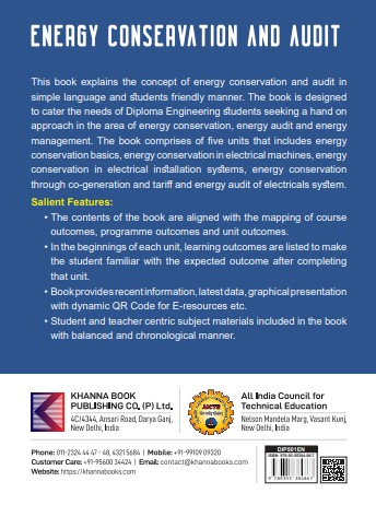 This book explains the concept of energy conservation and audit in simple language and students’ friendly manner. The book is designed to cater the needs of diploma Engineering students seeking a hand on approach in the area of energy conservation, energy audit and energy management. The book comprises of give units that includes energy conservation basics, energy conservation in electrical machines, energy conservation in electrical installation systems, energy conservation through co-generation and tariff and energy audit of electricals system.