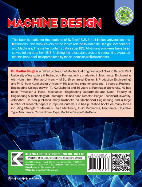 This book is useful for the students of B. Tech/ B.E. for all Indian Universities and Institutions. This book covers all the topics related to Machine Design components and Machines. The matter contains data as per BIS. A lot many problems have been solved taking data from BIS. utilizing the the latest standards and codes, it is expected that the book shall be appreciated by the students as well as teachers.