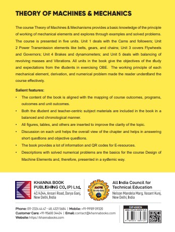 The course Theory of Machines & Mechanisms provides a basic knowledge of the principle of working of mechanical elements and explores through examples and solved problems. The course is presented in five units. Units 1 deals with the Cams and followers; Unit 2 power Transmission elements like belts, gears, and chains; Unit 3 covers flywheels and governors; Unit 4 Brakes and dynamometers; and Unit 5 deals with balancing of revolving masses and vibrations. All unit in the book gives the objectives of the study and expectations from the students in exercising OBE. The working principle of each mechanical element, derivation, and numerical problem made the reader understand the course effectively.